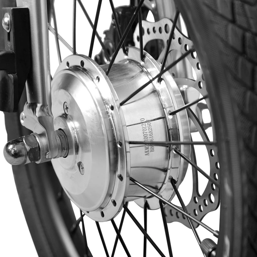 Small, like really small, yet fully-featured with disc brakes and the super wide 7 speed Nexus internal hub for a low maintenance and minimal design. It folds to a size that truly allows you to take on regional trains and is comparable in design to the famous Brompton 16inch bicycle. We have converted Brompton bikes for more than 7 years now and Brompton have finally released an electric version but tell them the price son! Very expensive. The E-micro is micro in budget and design.