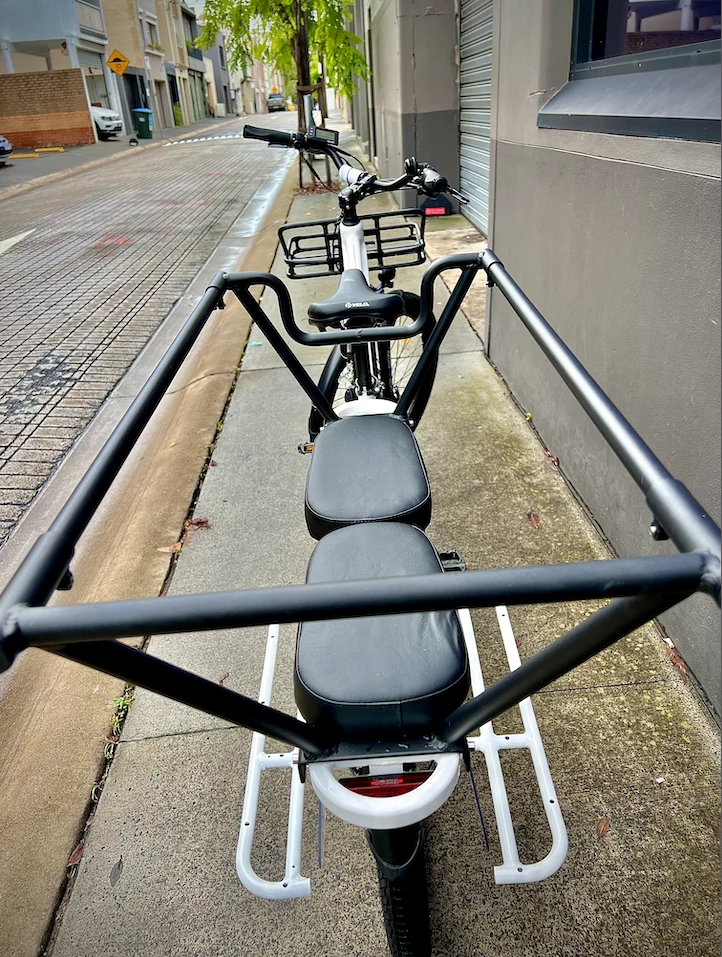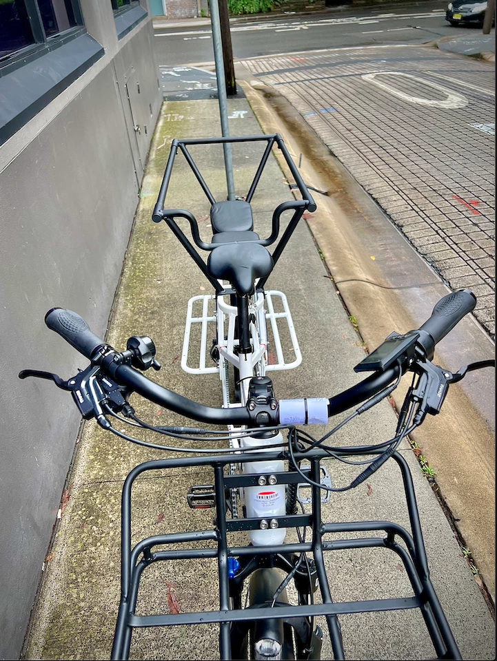 Built around a nice upright riding position and an adjustable handlebar stem these are designed to be ridden all day. The low stepover height plus a 400mm seat post means riders can be between 160-200cm in height. There’s enough room on the back for 3 kids (without the kids seats) and it comes with padding for the rear rack. The monkey rear rail bars and front basket rack are also included.