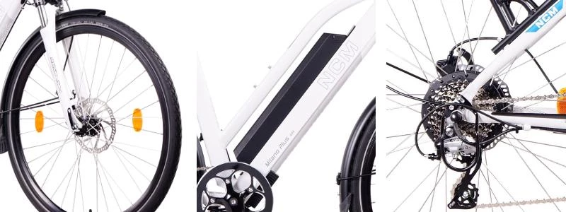 With hydraulic disc brakes, the NCM Milano Plus also includes extra gears (24) and 8 speeds.