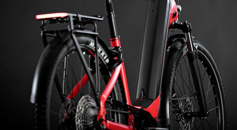 The decision to use 650B wheels with 2.25″ off-road tread pattern for our CC models is not just a design feature but has more practical reasons. To add big volume tyres to an e-bike provides increased comfort but also extra traction and therefore more safety reserves. Small and even bigger bumps can easily be rolled over, and a big volume tyre provides more puncture protection compared to a narrow one.